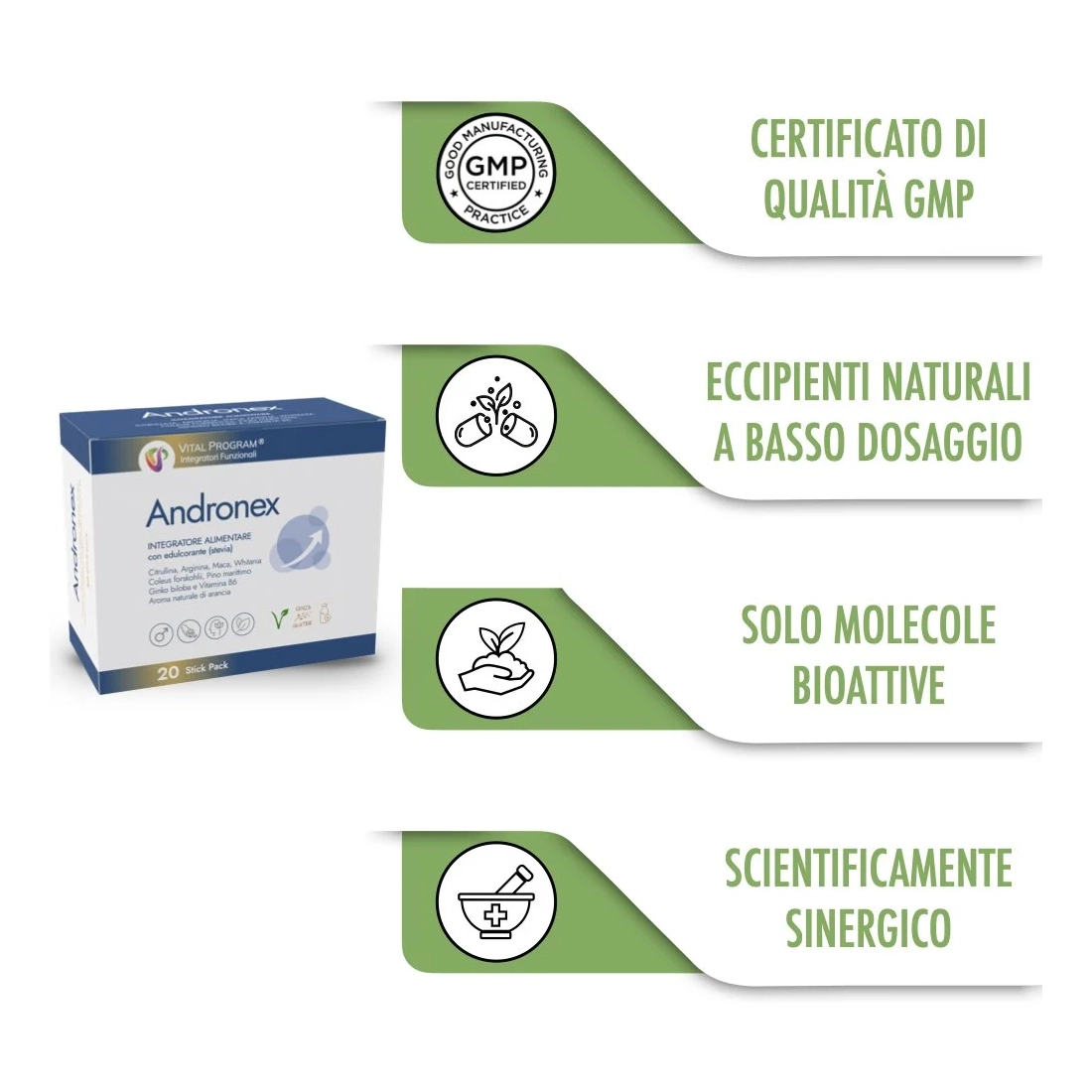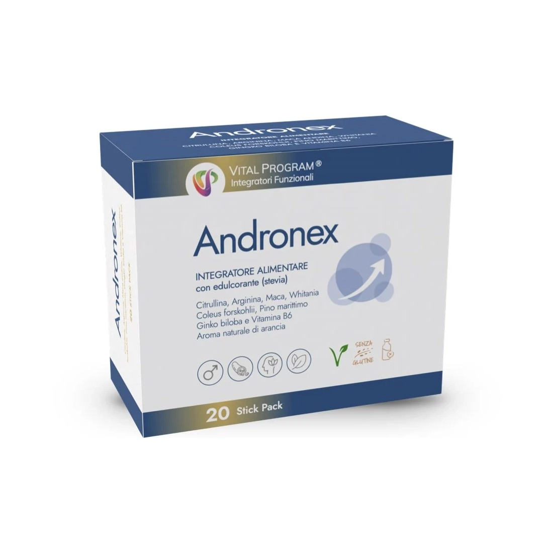 Andronex è un integratore funzionale pensato per l’uomo, a base di molecole naturali che forniscono un supporto quotidiano e un riequilibrio fisiologico in caso di stress, ridotta vitalità e difficoltà di concentrazione.