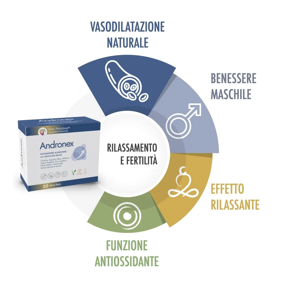 Andronex è un integratore funzionale per la fertilità maschile a base di estratti vegetali e nutraceutici noti per supportare la funzione sessuale e riproduttiva maschile, la fertilità, la normale produzione di testosterone, la normale funzione vascolare e la normale risposta allo stress.